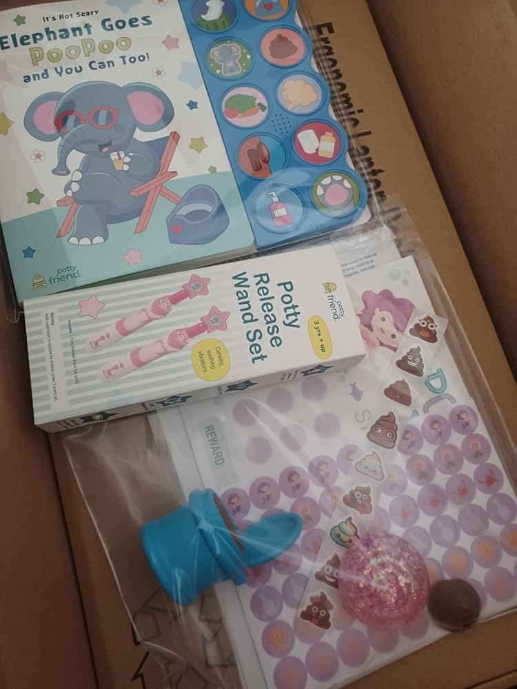 - One set of stickers, a potty sticker chart, and squeezable poop fidget toys